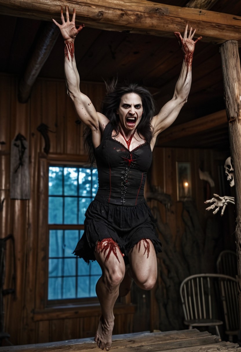 Close-up shot Curvey, very muscular, 40 year old female vampire. Long, unkempt dark hair. Tattered dress. Bare feet. Dirt smudges. Jumping at viewer in room in rundown log-cabin. Looking at viewer. Arms out, reaching. Claws. Laughing. Fang. Night. Forest visible through windows. Skeletons hang on walls Gum trees.