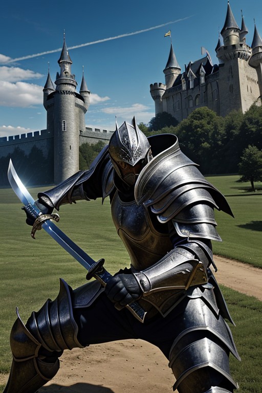 1boy, solo, solo focus, teenage, wear medium armor, black armor theme, right hand holding a sword, fight pose, outdoor, castle in the background, no helmet