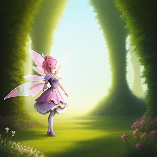 A woman with elaborate fairy-like clothing; the woman has pink skin and fairy clothing, the woman poses in a beautiful garden