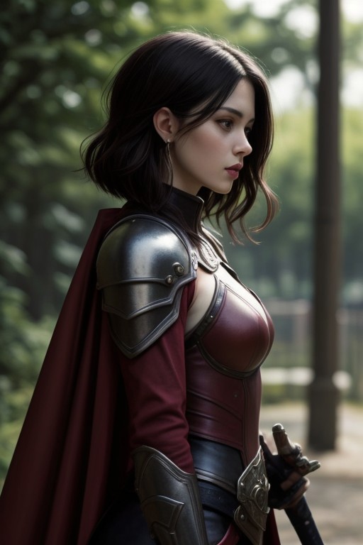1girl, weapon, sword, solo, armor, holding, holding weapon, holding sword, earrings, cape, jewelry, blurry background, shoulder armor, brown hair, blurry, breasts, medium breasts, profile, science fiction, outdoors, from side, parted lips, artist name,