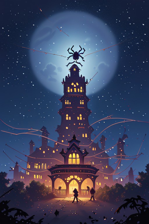 looking through a window in the background there is a starry sky, some shooting stars passing by and a spider web descending from the top of the window to the middle toon, monster