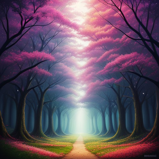 Wizard of Oz, enchanted_forest, surreal_shapes, vibrant_colors, magical, mysterious, glowing_trees, whimsical, fantasy, dreamy_atmosphere, ethereal_light masterpiece, best quality, newest, absurdres, highres