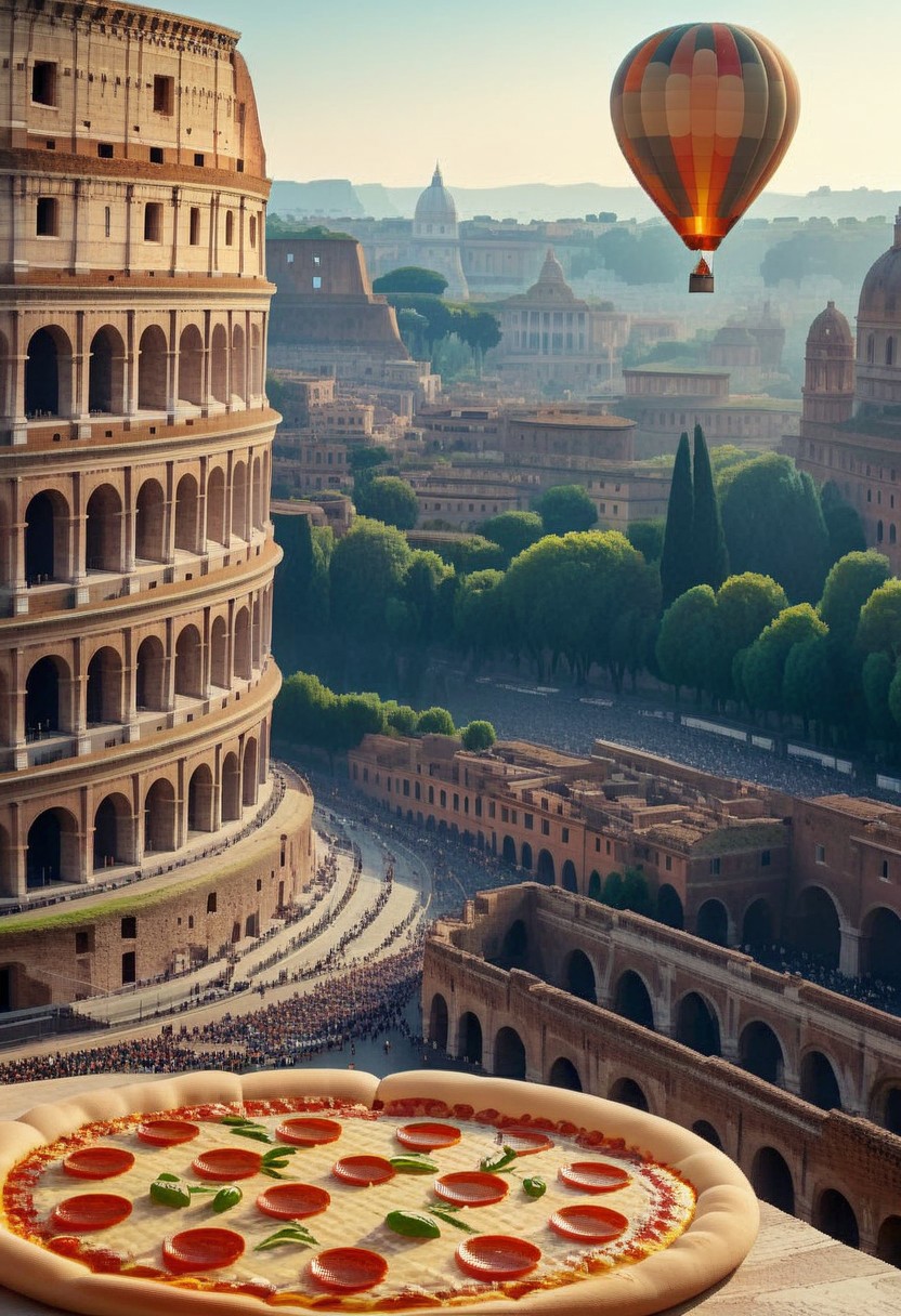 (A pizza balloon flies over the Colosseum in Rome:1.3), beautiful, cinematic, incredible, intense, intricate detail, very precise, professional, highly detailed, emotional, shiny, glowing, transparent, complex, amazing composition, pure color, colorful, determined, attractive, elegant, romantic,, best, dramatic, sharp focus, elaborate, extremely fine, futuristic, fancy