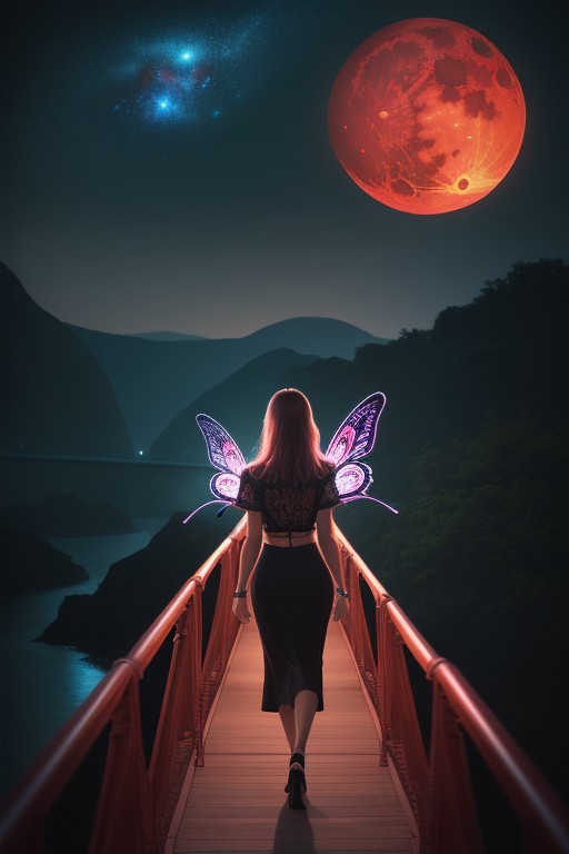 mega beautiful neon butterfly suspension bridge on the night cliff, beautiful girl walking on the bridge, rich colors, play of colors, fairy tale landscape, red moon, stardust, rainbow, macro, detail drawing, realistic, intricate details, hyper-detailed, kodak 50mm lens, professional photoshoot, full-hight scene view, intricate details, vivid colors, 50mm lens, octane rendering, professional photoshoot