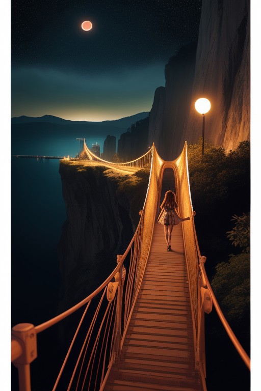 mega beautiful neon butterfly suspension bridge on the night cliff, beautiful girl walking on the bridge, rich colors, play of colors, fairy tale landscape, red moon, stardust, rainbow, macro, detail drawing, realistic, intricate details, hyper-detailed, kodak 50mm lens, professional photoshoot, full-hight scene view, intricate details, vivid colors, 50mm lens, octane rendering, professional photoshoot