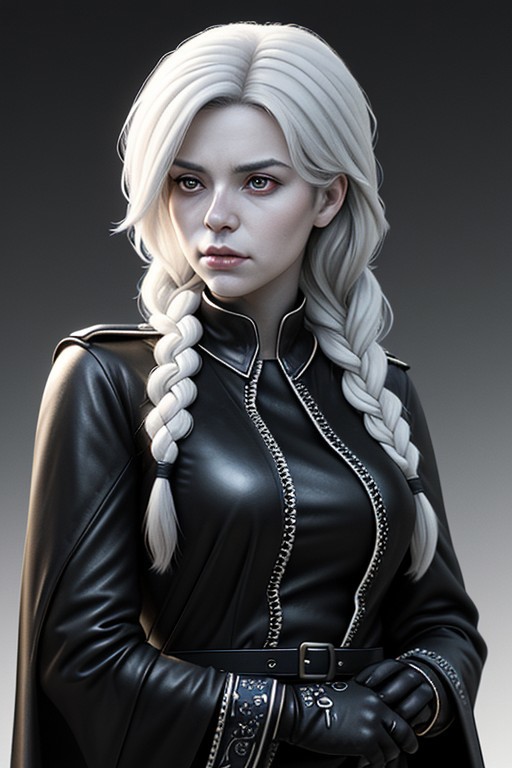 full-length portrait,She is a beautiful female Grim Reaper, with silver-white hair elegantly braided together, her piercing red eyes partially obscured by loose strands of hair. She wears a black, tailored military-style outfit adorned with belts and intricate details. Her hands are clad in textured black leather gloves, with her right hand gripping a scythe and her left hand resting on the other side. The atmosphere is tense, with soft, diffused light casting sharp, realistic shadows on her pale skin and serpentine form. The background is a hazy, abstract environment that enhances her eerie and powerful presence. Every detail, from the braiding of her plaits, is rendered with utmost realism, making the scene vivid and lifelike.