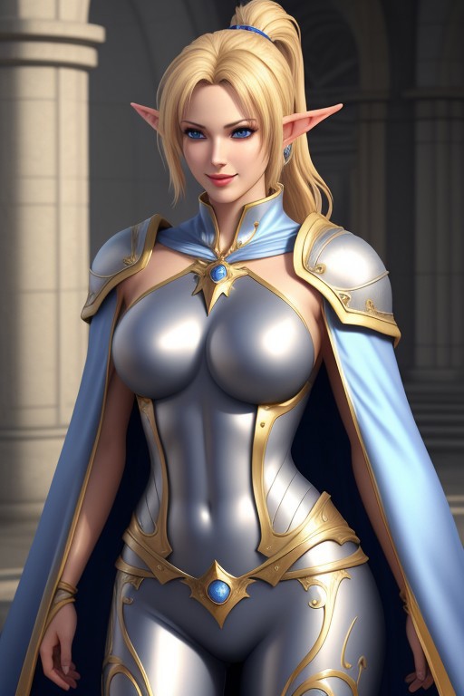 firiona vie, everquest franchise, long blond ponytail hair, blue eyes, high elf, shinny metallic light blue two piece outfit and cape, elvish clothing, jewellery, shiny skin, seductive smile, seductive look, naughty face, perfect replica, exact replica, cute, elegant, majestic, detailed, hourglass figure, curvy, pretty, beauty, perfect, sexy, seductive, busty, athletic body, muscular body, large breasts, firm breasts, perky breasts, ultra realistic, masterpiece, high detailed skin, high definition, high quality, anime cgi