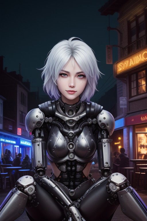 score_9, score_8_up, score_7_up, Anime Style, Cowboy Shot, mechanical android, girl, cute, seductive, innocent, light smile:0.3, plump lips, slender body, short punk hair, (mechanical arms), wires and cables, silver body, glowing led parts, ornaments detailed, sitting outside a pub, neon lights, bright colors, street night background, depth of field, dynamic angle, fashion photography, sharp, hyperdetailed:1.15