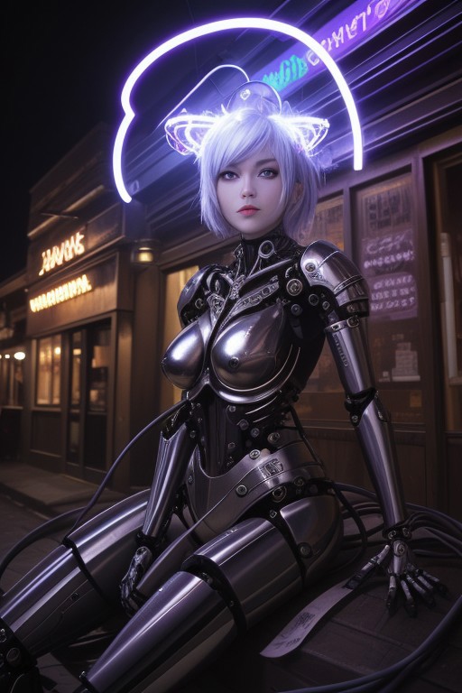 score_9, score_8_up, score_7_up, Anime Style, Cowboy Shot, mechanical android, girl, cute, seductive, innocent, light smile:0.3, plump lips, slender body, short punk hair, (mechanical arms), wires and cables, silver body, glowing led parts, ornaments detailed, sitting outside a pub, neon lights, bright colors, street night background, depth of field, dynamic angle, fashion photography, sharp, hyperdetailed:1.15