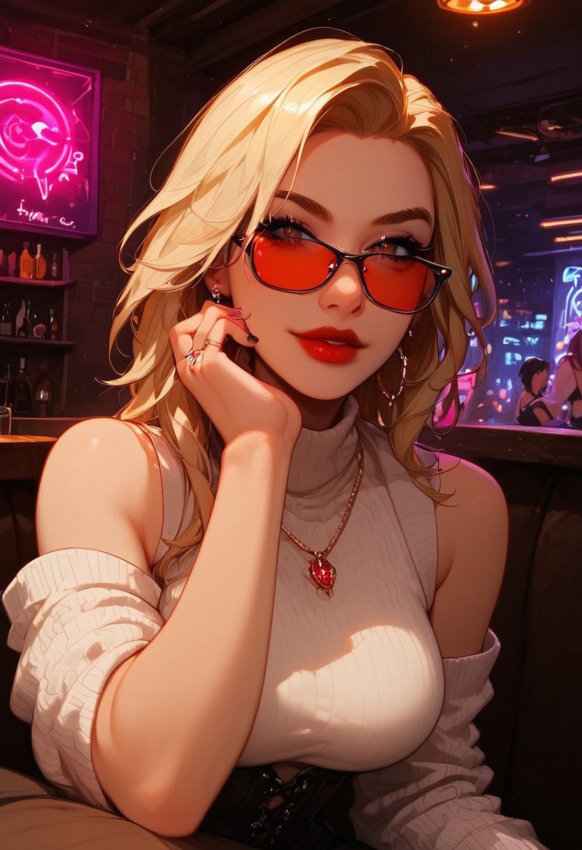 score_9,score_8_up,score_7_up,score_6_up,score_5_up, best_quality, ultra-detailed, masterpiece, close up, 1girl, jewelry, glasses, earrings, corset, looking at viewer, red nails, ring, bare shoulders, red lips, tinted eyewear, ribbed sweater, sleeveless sweater, turtleneck, black nails, black skirt, Break In a night club, sitting at the bar, looking from across the counter, neon lights, dark interior, neon glow,
