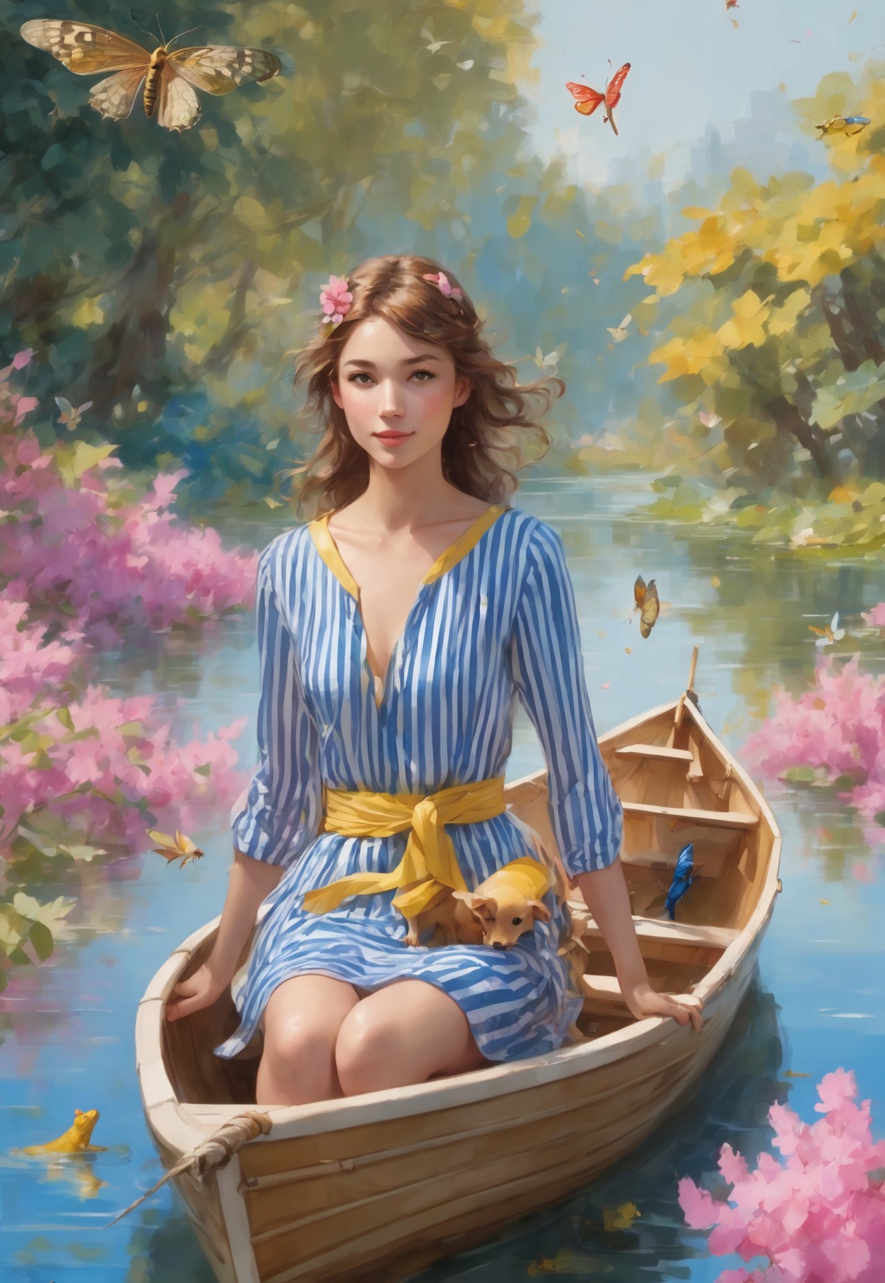 (highres lowres:1.07) (a young woman is sailing in a boat, the woman is dressed in a striped dress of blue and yellow colors, a frog, a dog and a squirrel are sitting in the boat, dragonflies and butterflies are flying over the water, pink bushes are blooming on the river bank)