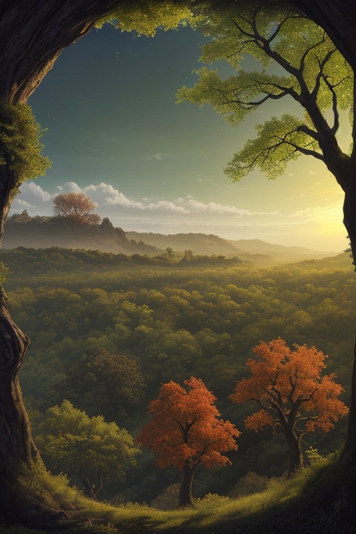 Large, gnarled, barren tree, (detailed trunk texture: 1.2), centered in frame, against Sun , (blazing sunlight: 1.1), light, moody morning sky, landscape centered on a small hill, fantasy style, light tone, dramatic lighting, (bright light, slightly elevated perspective, photorealistic style, digital art, bright yellows, deep blacks, green landscape; (detailed branches:1.1), slightly out of focus, sundominating upper portion of image, white tree, fantasy tree, green hill, epic, red leaves, epiCPhoto