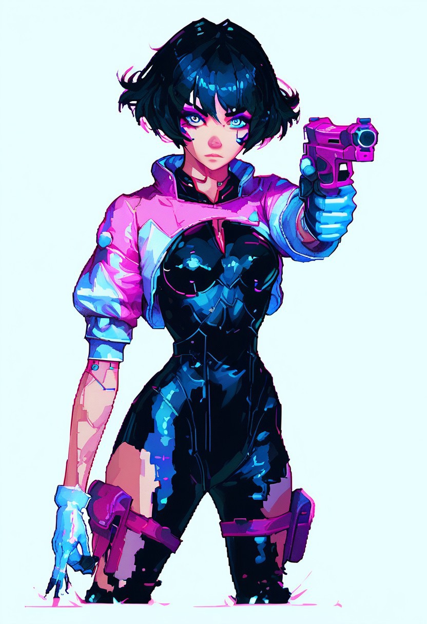 1girl, solo, cpsasha, black bodysuit, thigh holster, makeup, android, cropped jacket, gloves, short hair, black hair, multicolored eyes, handgun, aiming, white background, score_8_up, score_7_up, score_9, Pixel Art