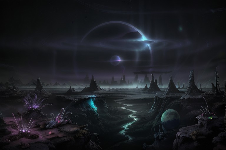 cosmiclandscapes, alien landscape, retro, mysterious, alien plants, strange growths, strange rock formations, desert, barren planet, lake, river, chasm, canyon, mountains, planet, star, neutron star, black hole, saturn, gas giant, galaxy, fog, pyramid, futuristic city, tall spires An alien world with breathtaking landscapes, featuring colossal ring structures floating in the sky, glowing with faint alien glyphs. The environment is a mix of lush, bioluminescent forests, cascading waterfalls flowing into iridescent lakes, and jagged, metallic mountain peaks. Strange alien flora with glowing, pulsating lights spread across the terrain, and hovering alien ships with sleek, futuristic designs patrol the skies. The atmosphere is otherworldly, with two suns casting long, dramatic shadows and a faint aurora stretching across the horizon. Soft mist rises from the ground, and the lighting creates a balance between mysterious and serene. The color palette includes hues of cyan, emerald green, and soft purples, blending into a cosmic twilight. Ultra-high detail, cinematic lighting, epic science-fiction style, 4K resolution, suitable for wallpaper
