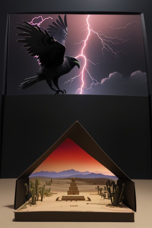 A highly detailed paper model cutout diorama depicting a Big black raven, thunder and lightning in black sky, behind him a desert and red space with a mayan piramid, the black raven is flying and open his wings, a plane hit by a storm flying in the distance. Intricate paper craft peephole box masterpiece.