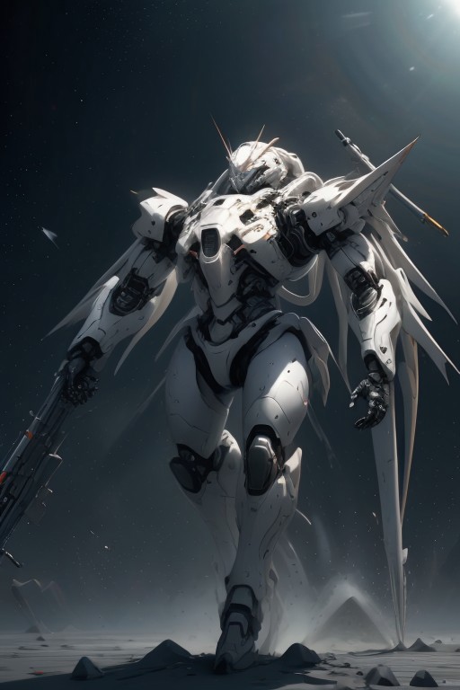 zzmckzz, mecha armor, blue color mecha armor theme, (flying toward the viewer:1.20), armaments equipped in the armor, (right hand holding beam rifle:1.20), space in the background:0.8