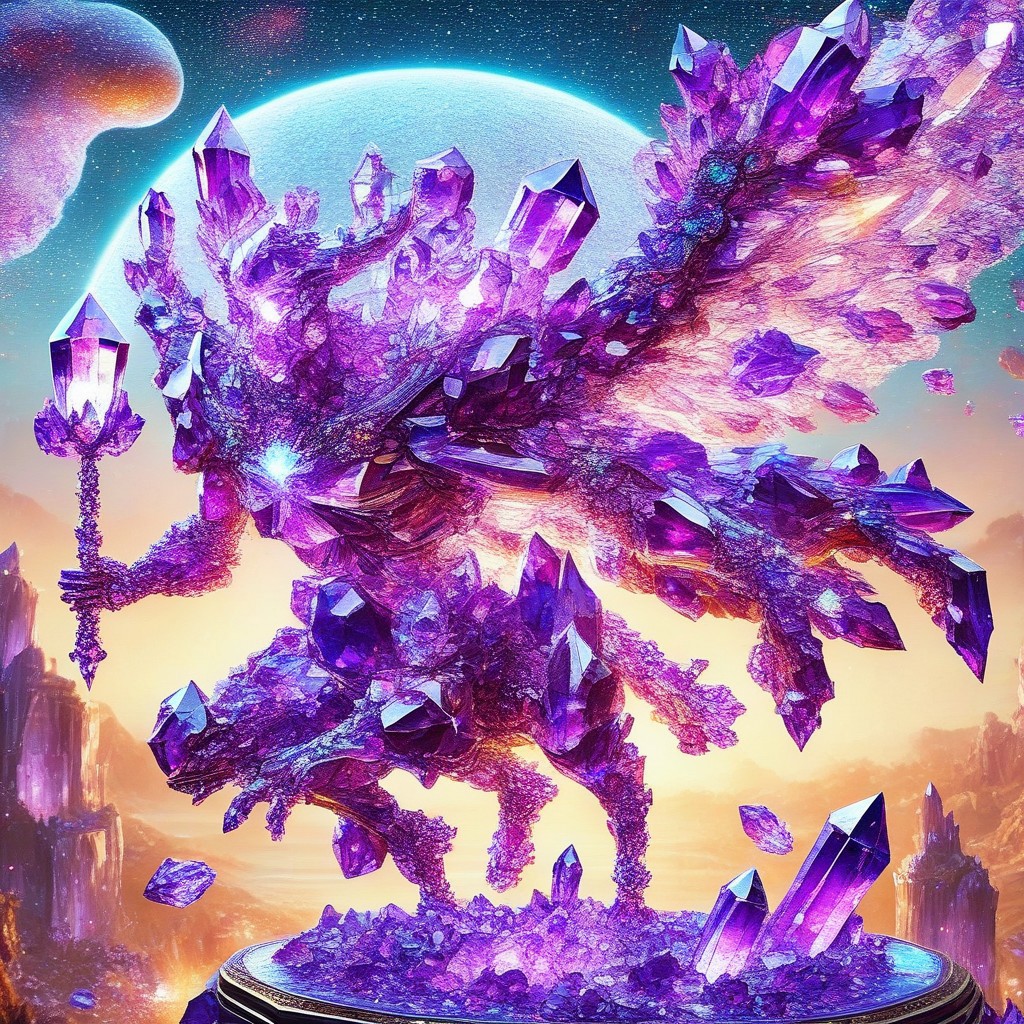 (rating :safe), ,1 human,female ,perfect anatomy, wizard, party squad,made of sparkling amethyst crystals, gems,meteor amethyst masterpiece, high quality