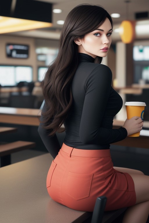 Luxury product style ((best quality)), ((masterpiece)), ((realistic)), <lora:quiron_meganFox_v050330_Lora:0.77> meganfoxQuiron woman, 1girl, long hair, black hair, makeup, is working in a mc donalds and wears the mc donalds uniform. She serves hamburger and fries. , Sitting with back hunched, peach-colored velour turtleneck, cargo skirt, . Elegant, sophisticated, high-end, luxurious, professional, highly detailed