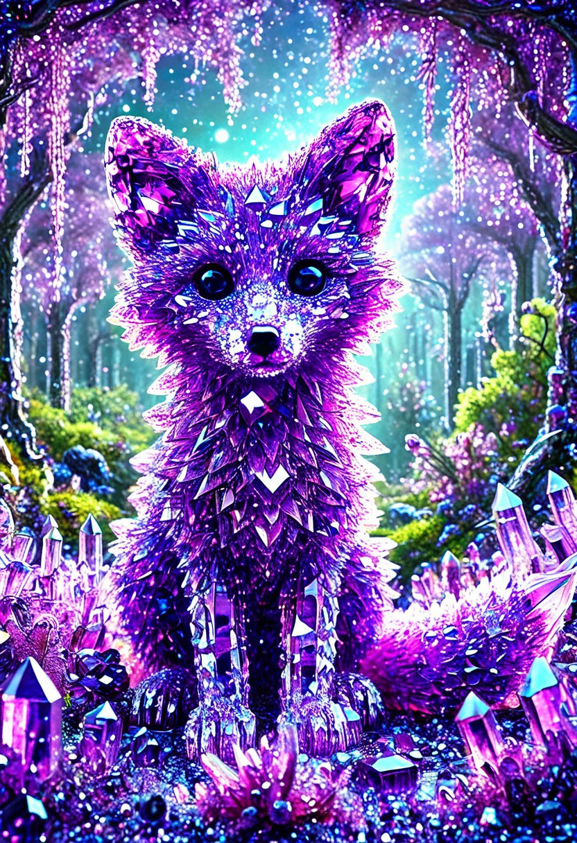 An ultra-detailed macro photograph of a cute microscopic fox entirely made out of sparkling amethyst crystals in a prismatic forest with strange and unknown plants and animals, mystical, stunning, highly detailed, award winning, cinematic still, dreamlike, otherworldly, swirling energy surrounds the fox, vivid colors, dramatic lighting, by night, digital art, intricate patterns, zavy-flrscnt