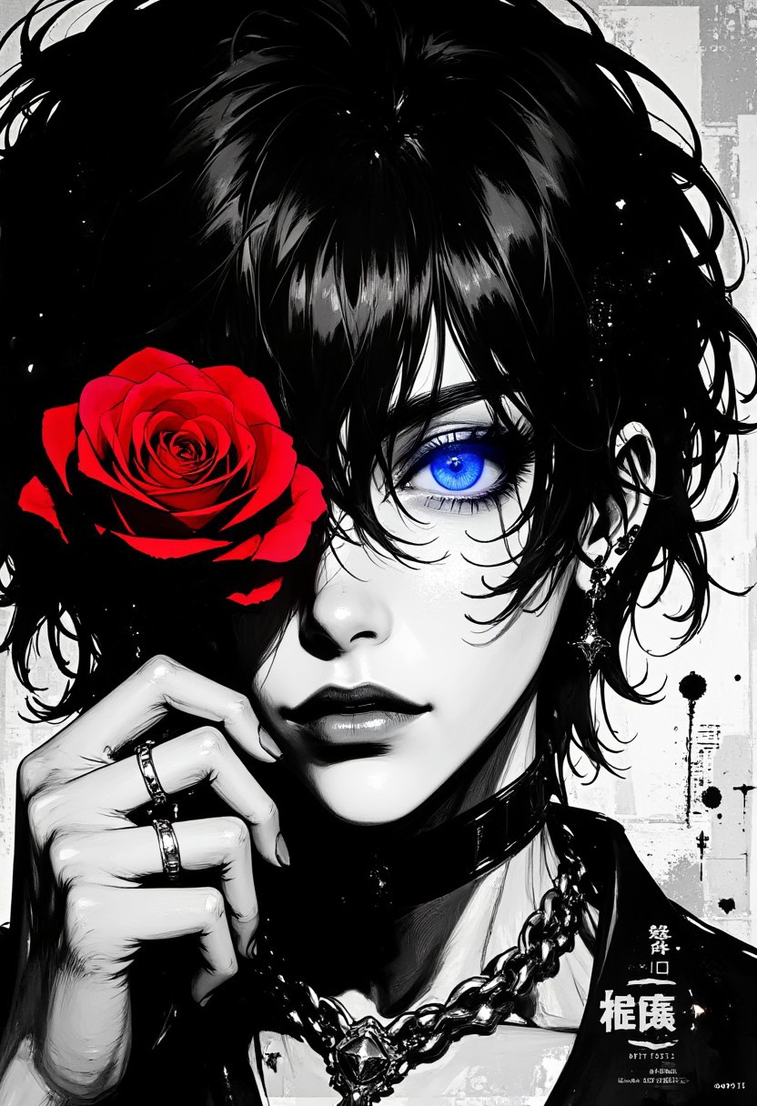 A close-up, artistic portrait of a mysterious character with wild, disheveled black hair obscuring parts of their face. clutching a vibrant red rose in her hand, chain rolls down offscreen, One eye is vividly glowing in an intense blue hue, radiating with a subtle, ethereal energy that contrasts against the darker tones. The expression is a mix of sorrow and menace, The artwork features glitch effects and digital distortions, creating an otherworldly, fragmented aesthetic. The style is bold, with heavy black ink strokes and high contrast, accentuated by abstract visual noise and scratches, emphasizing a chaotic, digital dystopian theme.