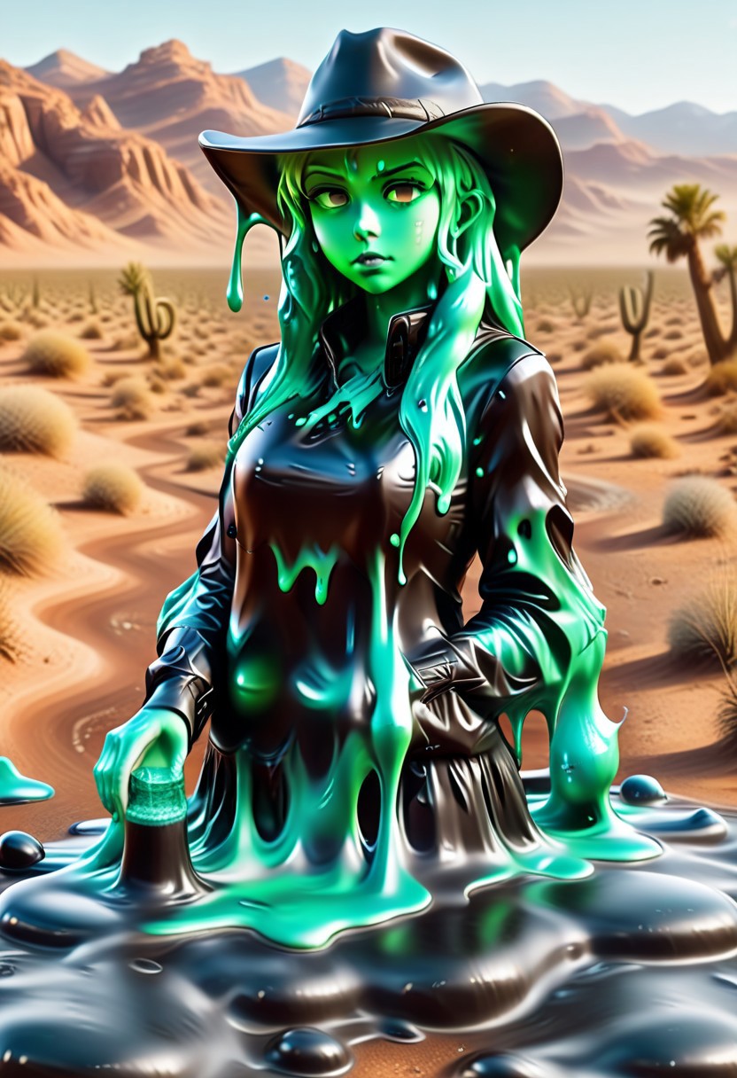 25 year old, score_9, score_8_up, score_7_up, score_6_up, score_5_up, score_4_up, source_anime, oily slime girl, inky skin, MADE OF TAr, ONE HAND AT SIDE, ONE HAND ON HIP, tilted SIDE, COCKY GRIN, CLOSED LIPS, outside, rural town, DESERT TOWN, wind, cowboy shot, humanoid, solo, <lora:slimegirlsupremacy:1>, detailed, beautiful, (meltinglora:0.2) (glowing hair, Feuerhaare, hair made of fire: 1.2)