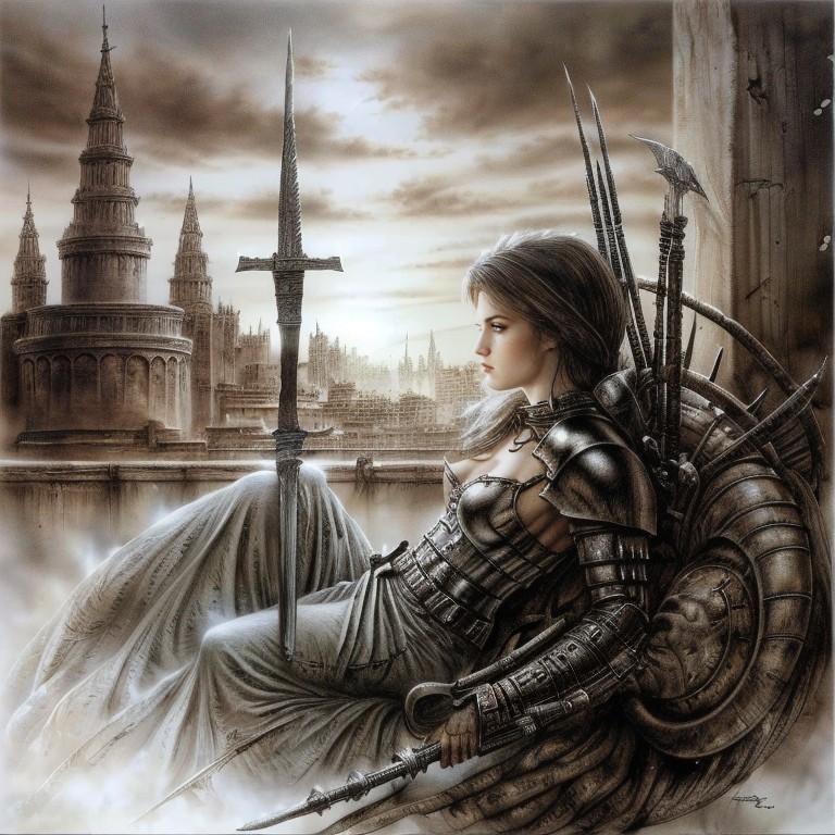 Royo, realistic drawing, female, solo, queen, armor, pretty, beautiful, sitting on throne, weapons, ruins in background