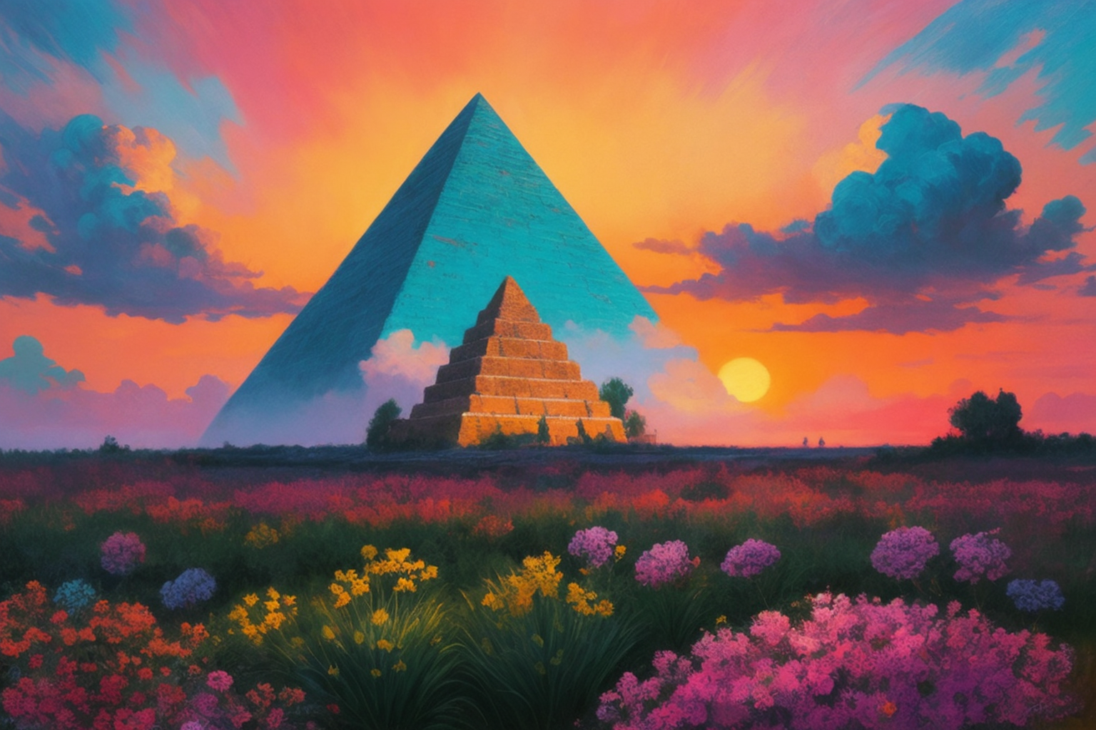 alien plants, brick pyramid in background, sunset, colorful clouds, brush strokes , impressionist oil paint style, ,,CS-CYBR ,<lora:shadowfix3:0.3>,, ,best quality,<lora:Iridescence:0.5> , , <lora:painterly:.4>, <lora:more_details:.4> ,