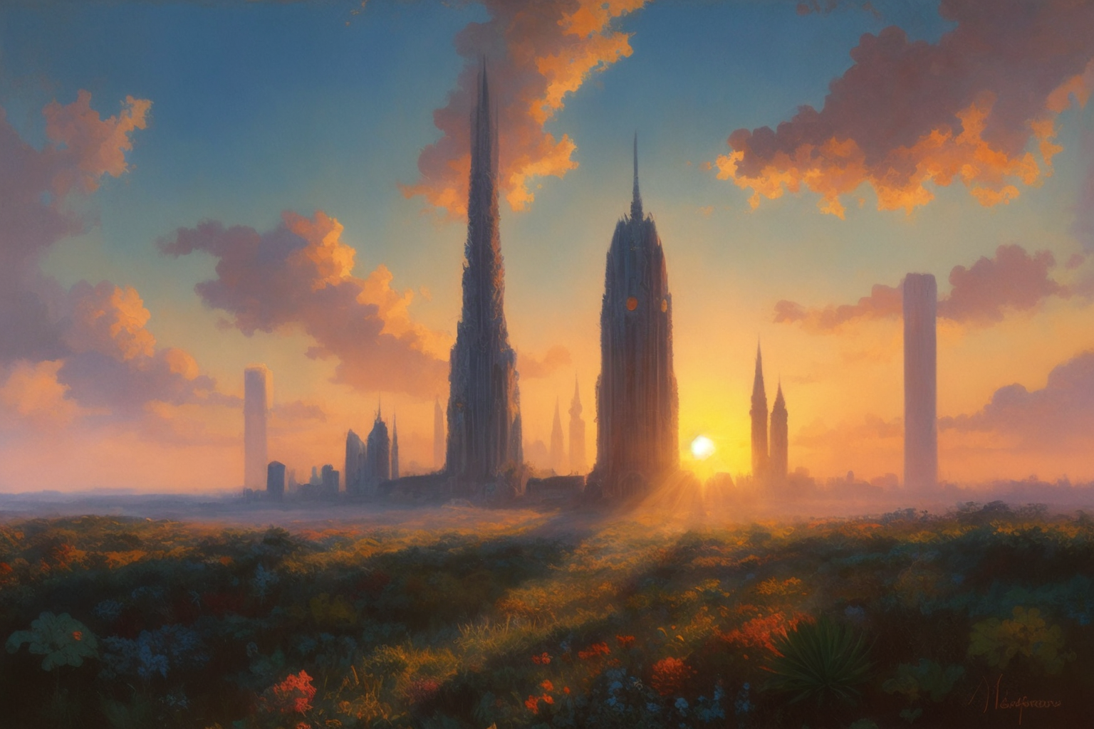 alien plants, wizard towers in background, sunset, colorful clouds, brush strokes , impressionist oil paint style,Style-GHL ,, ,<lora:shadowfix3:0.3>,, ,best quality,<lora:Iridescence:0.5> , , <lora:painterly:.4>, <lora:more_details:.4> ,