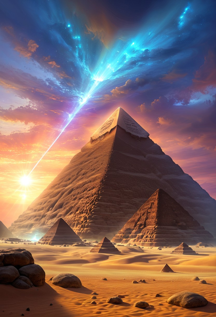 (by Ellen Jewett:1.5), (Bioluminescent Impressionism, Egyptian landscape, The Dreamland, Egyptian desert, sand, rock, great pyramids, fine pyramids, smooth pyramids, very smooth techno pyramids with great beams of light shooting up into the sky, sky sunset, sunrise ,waterfall, ethereal landscapes, depth of field, biotech emotion:1.3) <lora:xl_more_art-full_v1:0.5> <lora:add-detail-xl:1> <lora:RMSDXL_Creative:2>, mountains, gleaming, beams of light