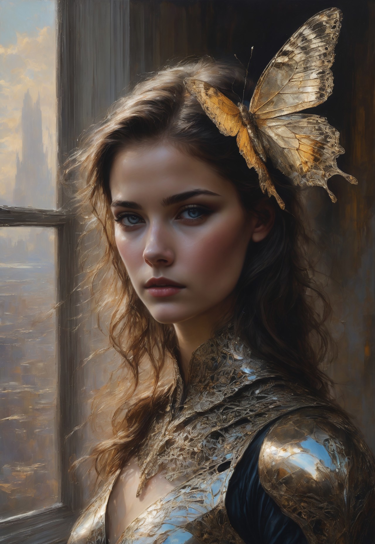 In Casey Baugh's evocative style, art of a beautiful young girl cyborg with long brown hair, futuristic, scifi, intricate, elegant, highly detailed, majestic, Baugh's brushwork infuses the painting with a unique combination of realism and abstraction, greg rutkowski, surreal gold filigree, broken glass, (masterpiece, sidelighting, finely detailed beautiful eyes: 1.2), hdr, realistic painting, natural skin, textured skin, closed mouth, crystal eyes, butterfly filigree, chest armor, eye makeup, robot joints, long hair moved by the wind, window facing to another world, Baugh's distinctive style captures the essence of the girl's enigmatic nature, inviting viewers to explore the depths of her soul, award winning art <lora:aesthetic_anime_v1s:1>
