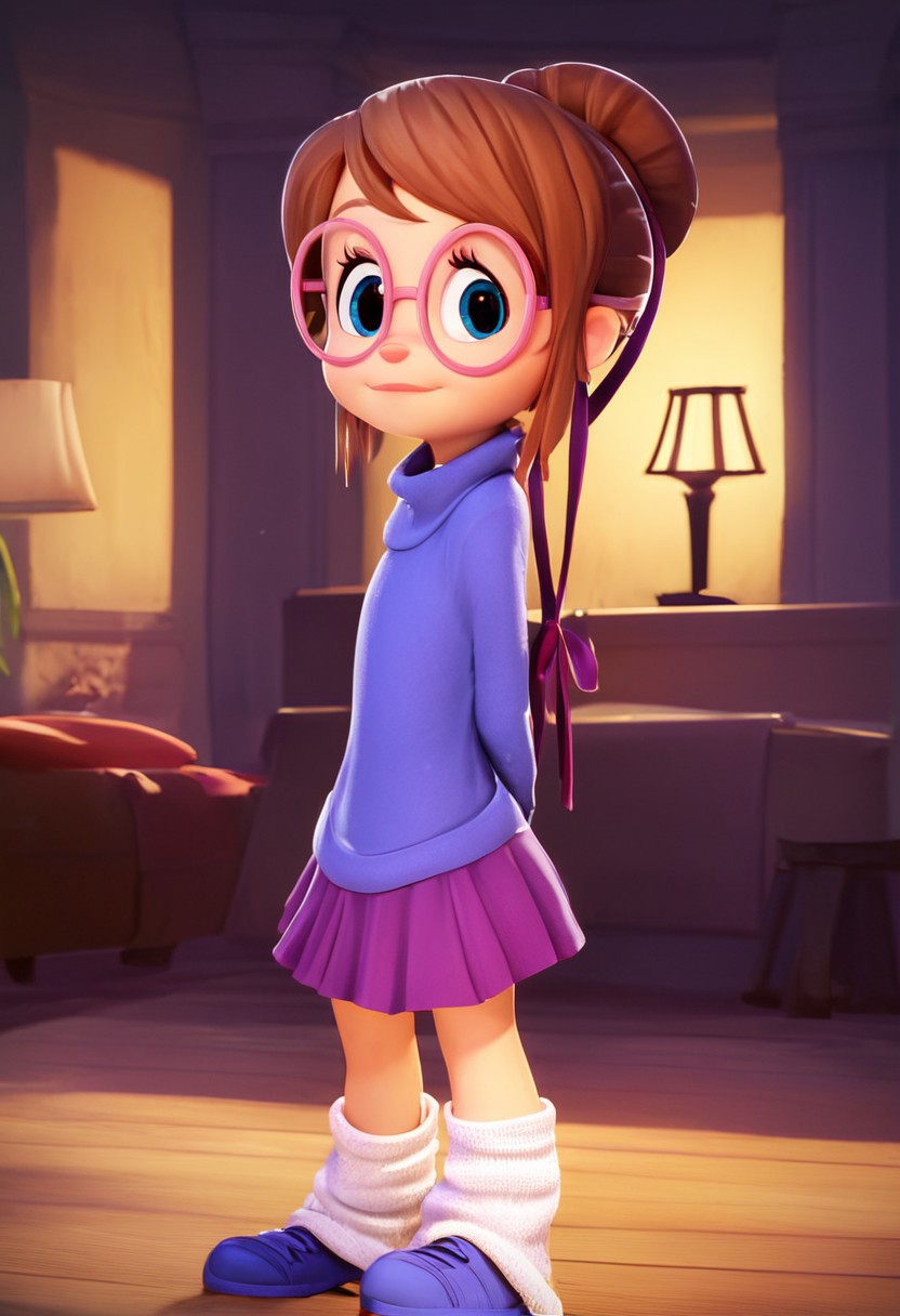 (masterpiece), 8k, best quality, ultra-detailed, (high res), cinematic lighting, beautiful lighting, high quality, studio quality, detailed, insanely detailed, extreme detail, refined detail, perfect detail, max detail, smooth lighting, detailed background, hyper detailed body, beautiful lighting, vibrant lighting, global illumination, absurdres, high-res, dynamic lighting, score_9, score_8_up, score_7_up, score_6_up, score_5_up, score_4_up, ponypositive, 1girl, solo, solo focus, (narrow waist, skinny, small body, slim), looking at viewer, (indoors, bedroom), bright lighting, daylight, sunshine, cute, kawaii, gleaming eyes, big eyes, (closed mouth), happy, ((standing)), alone, Expressiveh, ((¾ view)), (hands by sides), (rating_safe, sfw), jeanette, brown hair, hair bun, hair ribbon, purple glasses, turtleneck sweater, skirt, loose socks, shoes, not human,