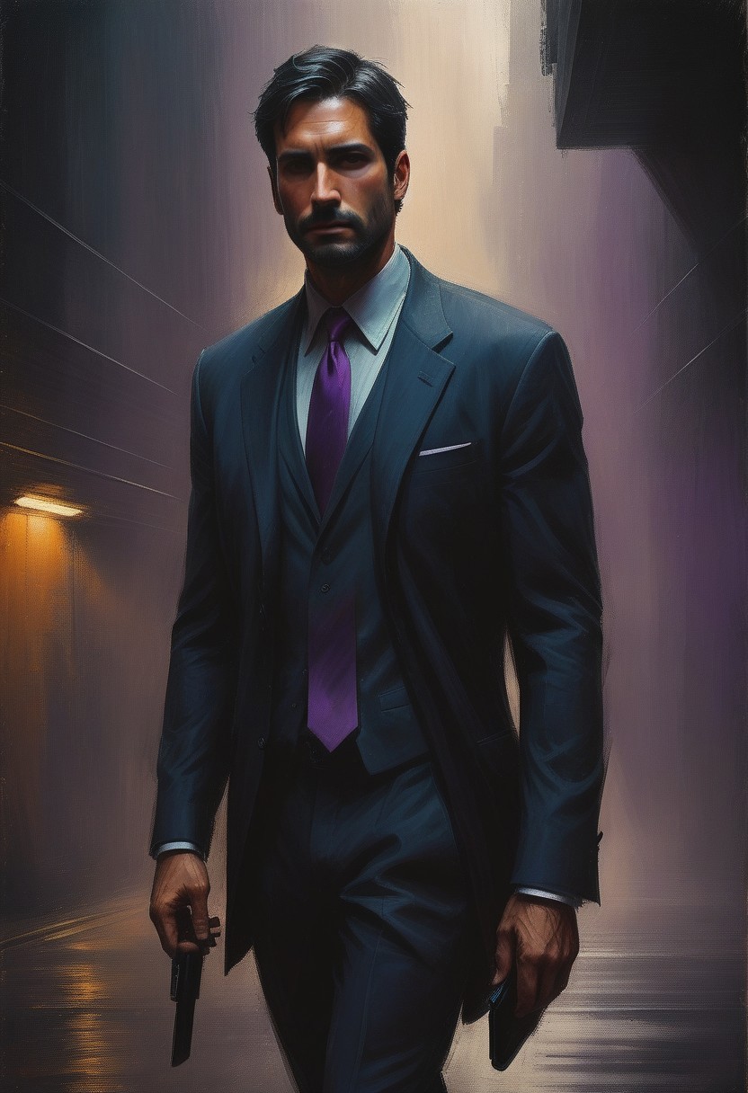 the g-man, thin middle-aged, suit, dark purple tie, briefcase, pale skin, black hair, dark blue eyes, expressionless, city 17 tunnel at night, cybernetic eye implant, Heavy pistol (thlstCE_style)
