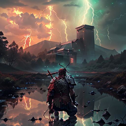 ((dark theme, dark atmosphere)), (temple:1.4), (a male samurai warrior, elder male, beard:1.1, kneeling, seiza:1.4,full body), ((samurai armor)), (heavy rain:1.3, lightning bolts), ((gorgeous landscape)), (((the landscape reflecting by his eyes))), (realistic:1.4), (best quality:1.5, master piece:1.5, highres, UHD, 4K, 8K, realistic textures and shodows, vibrant colors, cinematic lightning, light particles:1.1, crimson red glow:1.2), <lora:samuraiLoraV01:0.8>, <lora:hina_samurai_armor_v3:0.15>, <lora:Samurainiji:0.35>, <lora:fantasy00d:0.70> fantasy00d, <lora:quiron_LegendaryLandscapes_v1_Lora:0.4>