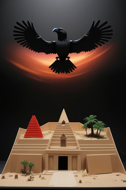 A highly detailed paper model cutout diorama depicting a Big black raven, thunder and lightning in black sky, behind him a desert and red space with a mayan piramid, the black raven is flying and open his wings, a plane hit by a storm flying in the distance. Intricate paper craft peephole box masterpiece.