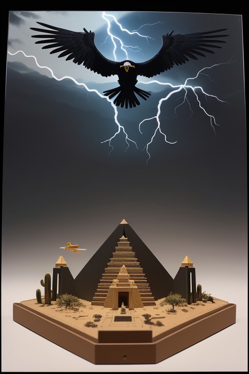 A highly detailed paper model cutout diorama depicting a Big black raven, thunder and lightning in black sky, behind him a desert and red space with a mayan piramid, the black raven is flying and open his wings, a plane hit by a storm flying in the distance. Intricate paper craft peephole box masterpiece.