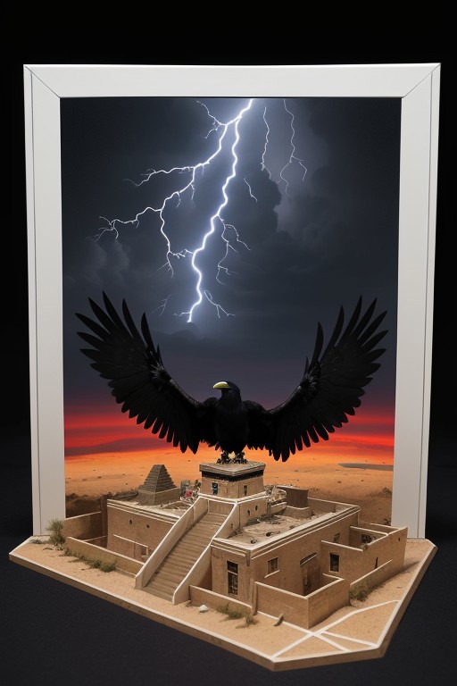 A highly detailed paper model cutout diorama depicting a Big black raven, thunder and lightning in black sky, behind him a desert and red space with a mayan piramid, the black raven is flying and open his wings, a plane hit by a storm flying in the distance. Intricate paper craft peephole box masterpiece.