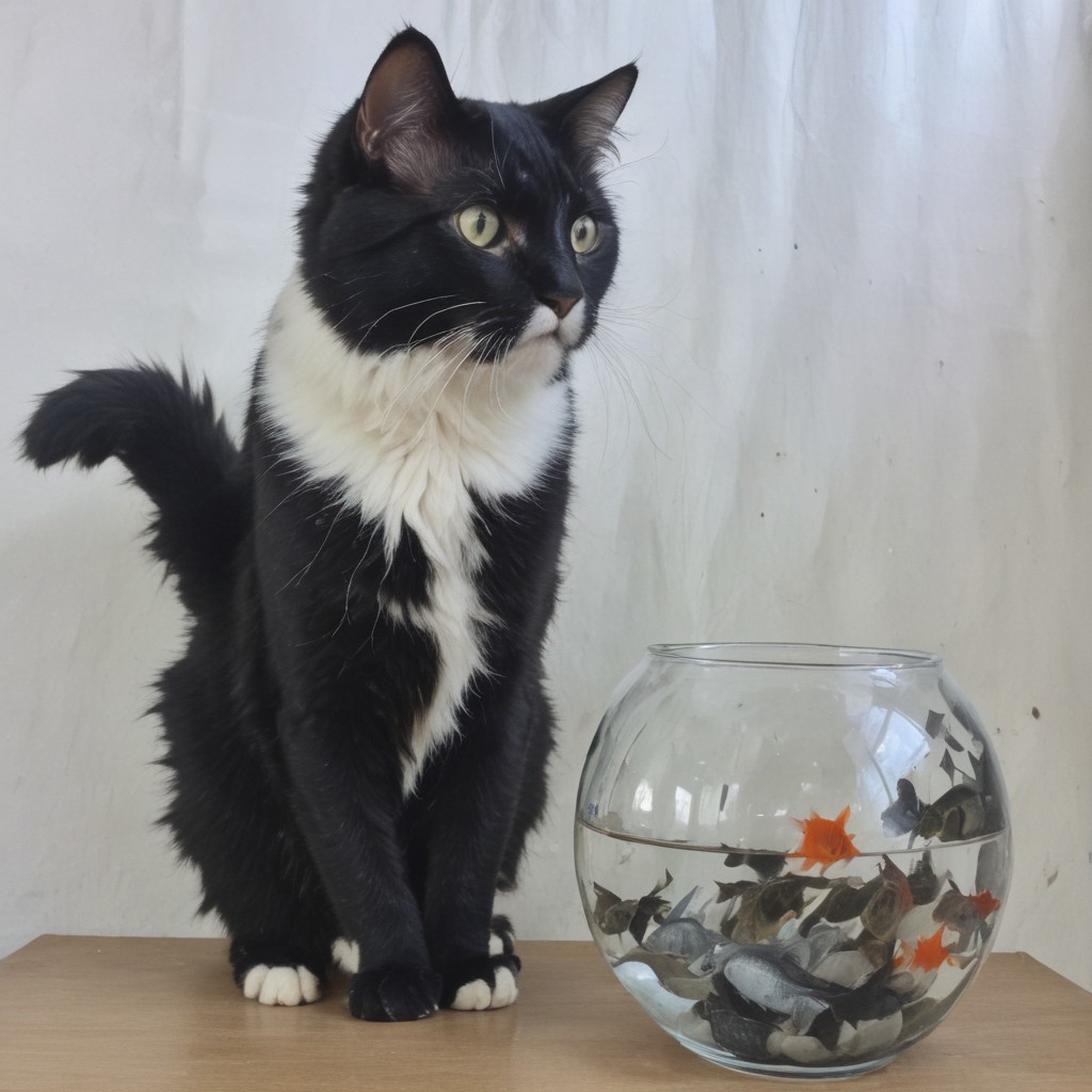 cute_cat, black_and_white_fur, playing_with_fish, fish_in_fishbowl, playful_pose, curious_expression, vibrant_colors, indoor_scene, adorable, heartwarming_moment, detailed_fur, glass_fishbowl, aquatic_environment masterpiece, best quality, newest, absurdres, highres