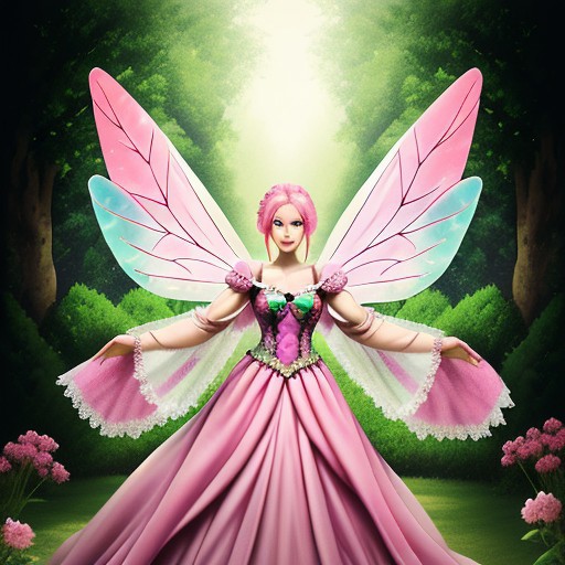 A woman with elaborate fairy-like clothing; the woman has pink skin and fairy clothing, the woman poses in a beautiful garden