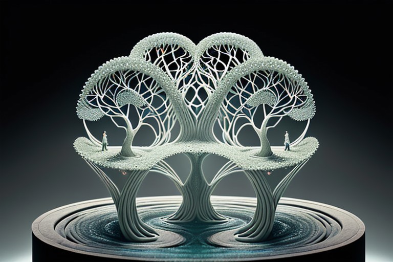 Create a visually stunning, mathematically intricate scene that blends nature-inspired fractal patterns with the shadows of higher-dimensional geometric shapes. Incorporate elements such as delicate fractal trees, flowing water motifs, and organic symmetry, seamlessly intertwined with ethereal, multi-dimensional shadows that suggest unseen dimensions. Utilize gradient lighting to highlight depth and complexity, balancing the serene beauty of natural forms with the enigmatic elegance of advanced mathematical structures. The composition should be both challenging to render and aesthetically captivating, showcasing infinite symmetry and intricate details that evoke a sense of wonder and complexity.