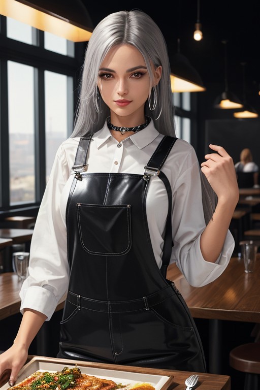 A hot, attractive, mysterious, smiling, goth female waitress, aged 20, with black, long hair and sidecut, serving food in a dark, dirty restaurant, while wearing long, glossy, black, plastic bib overalls, and a clean, white office blouse. She has a lot of silver chains, buckles, straps, leather collar, and details on her overalls. Females in the background. Masterpiece, best quality.