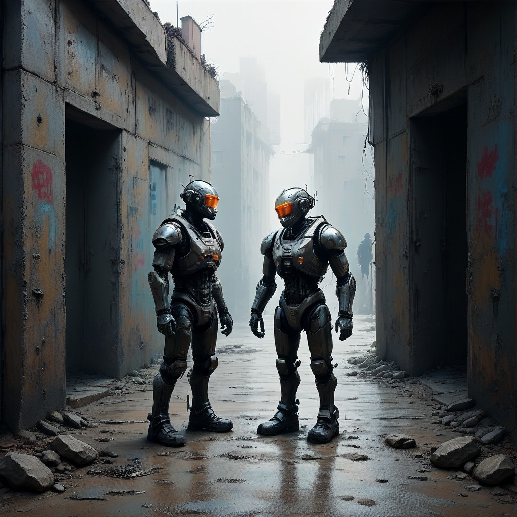A lone cyberpunk robot walks through the ruins of a megalopolis (evi@decrepPunk, rmbrnksyCE style)
