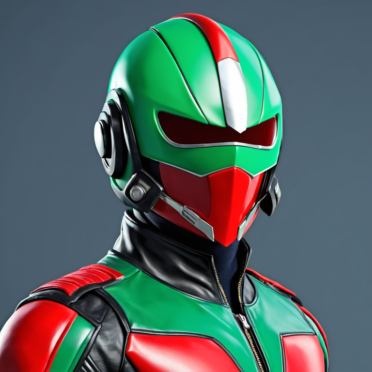 arafed man in a green and red helmet and a black leather jacket, tokusatsu, hyper realistic face, mexican, beak, unmasked, viridian and venetian red, unused design, toei, masked, heroism, nikkon