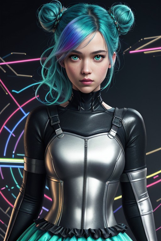young ([Jennifer( :0)Lawrence|Emma( :0)Watson]:0.9) round cute face focus, sexy, face closeup, face extreme closeup, rainbow hair, wearing metallic iridescent dress, green eyes, detailed clothes, skinny, shinny glossy skin, subsurface scattering, (gothic:0.8), double bun, bangs, frills, skirt, [(colorful explosion psychedelic paint colors:1.21)::0.2], (boorish:0.7), (darkness:1.1), cyberpunk, award winning photo, extremely detailed, amazing, fine detail, absurdres, braless