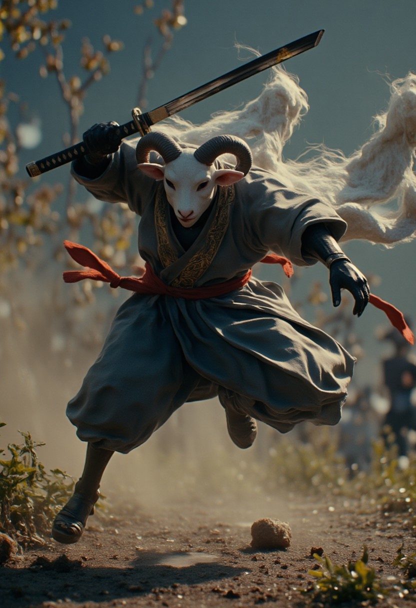 anthropomorphic Lamb ninja warrior leaping about wielding a samurai sword. photograph, action photography, cinematic,