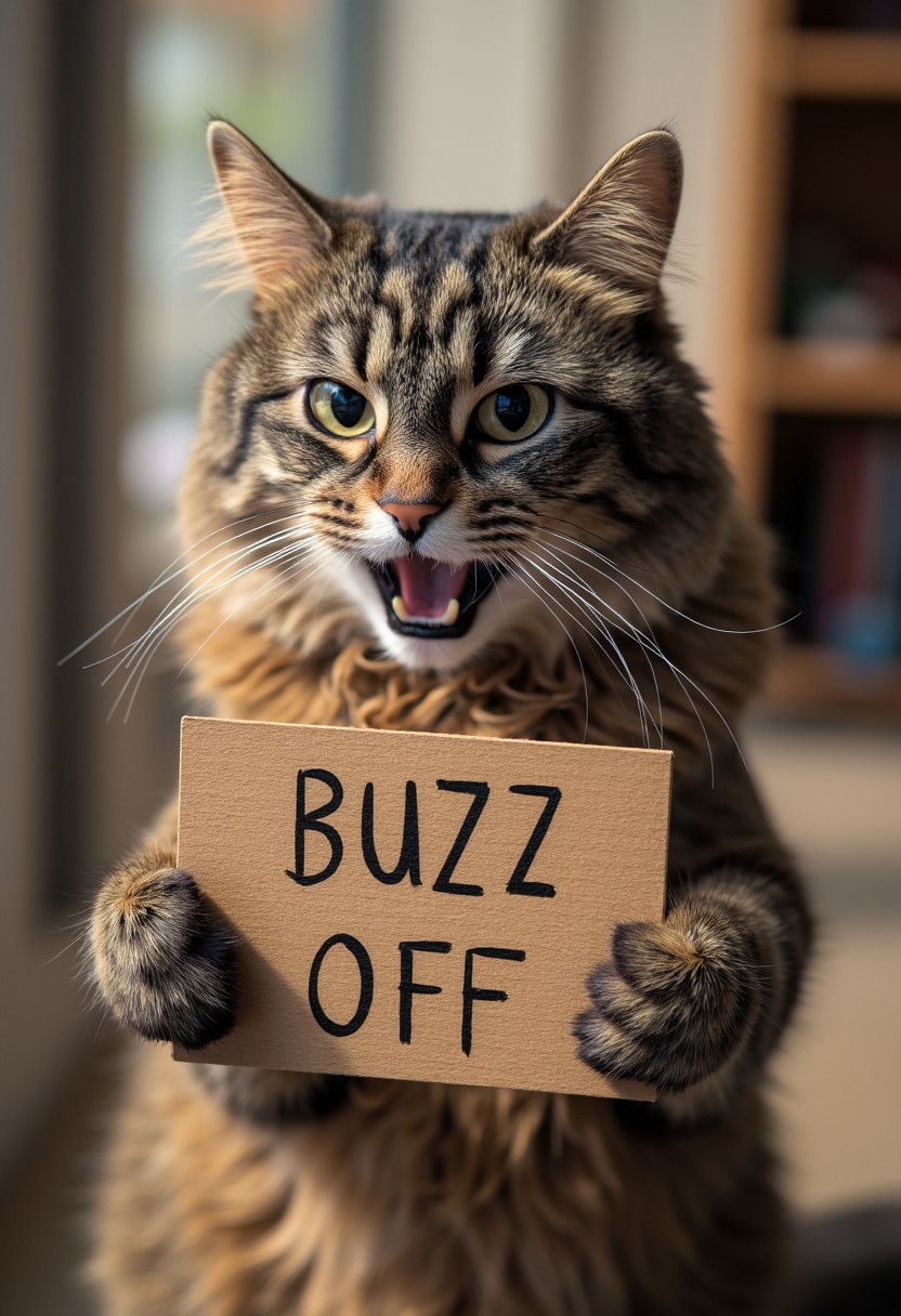 photograph of a fluffy, angry, evil looking, long-haired domestic cat named Allie holding up a wooden sign with the text "BUZZ OFF"