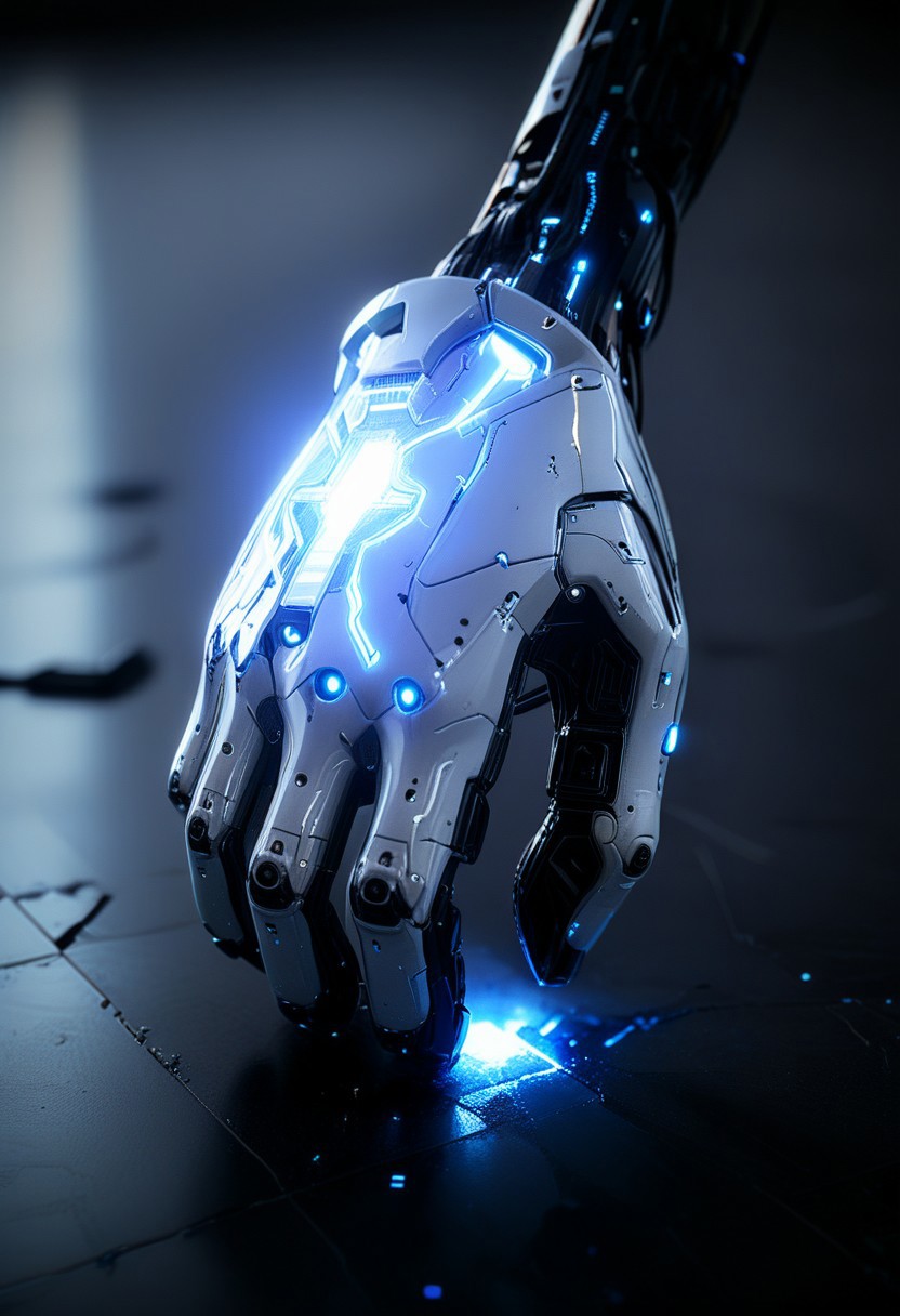 masterpiece, hyper detailed, very realistic photograph, score_9, high quality, (best quality:1.2), futuristic silver and blue glow cyborg fist made of silver and circuits and robot joints with glowing accents, breaking through the ground, black and blue pixel cubes on the floor, cracked broken floor, SilverPulse, techno lighting,