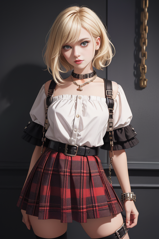 ((Masterpiece, best quality)), edgpskirt, a punk german blonde girl in a skirt and top posing for a picture, wearing edgpskirt, punk skirt, plaid skirt, multiple chains, buckle belts,