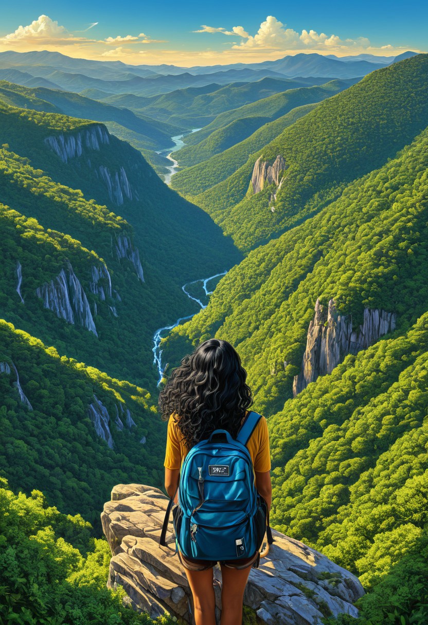 1girl, long curly black hair, olive skin, backpack, on the top of a mountain range. The mountains are covered in trees with craggy outcrops rising above the canopy. There is a high waterfall, in a valley leading to the sea. the sky is a brilliant blue with a little cloud and a bright sun is shining. HDR, gradient, painting,
