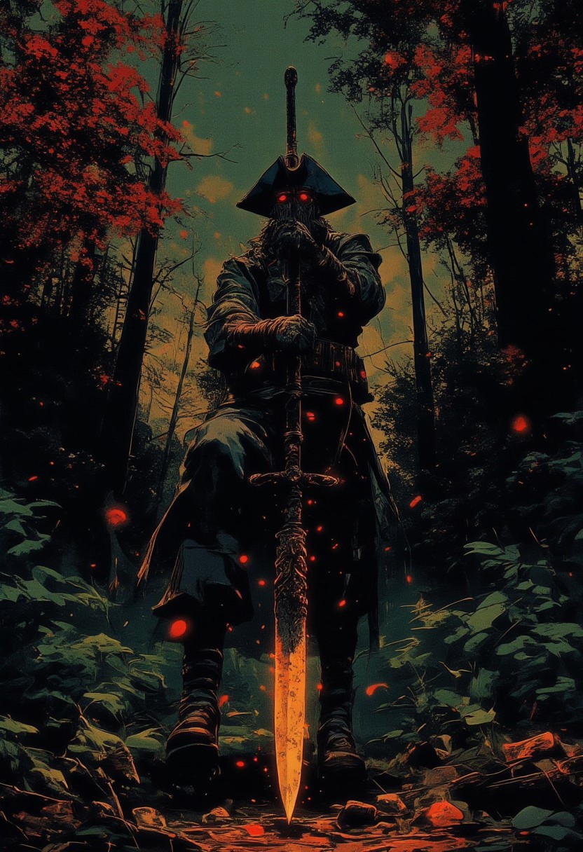 Solitary pirate, dense autumn forest, musket and great sword, tarnished silver chain, glowing life magic gem, forgotten altar, fallen leaves and moss, ancient chant, forest spirits, lost treasure. , the dark and moody background adds a dramatic tone, with subtle lighting highlighting metallic surfaces