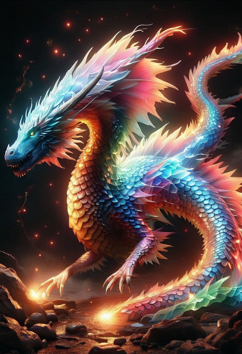 p1nk1r1sc4l3s, made out of iridescent scales, basilisk ,flaying at viewer,facing viewer, realistic, The background is the silhouette of a dragon emerges from the light, its form composed of the same vibrant energy. The entire scene is bathed in a contrast of deep blacks and brilliant scaled dragon, creating a dynamic and visually striking composition. Particles of light scatter through the air, adding to the mystical atmosphere. This digital illustration blends elements of anime artistry with futuristic aesthetics, resulting in a captivating image that radiates energy and intensity, snowing, , bright thunder, red fireflies lightning <lora:CyberRealistic_Negative-neg:1> <lora:patty_cake:1> <lora:detailed_notrigger:1> <lora:XL_boss_battle:1>